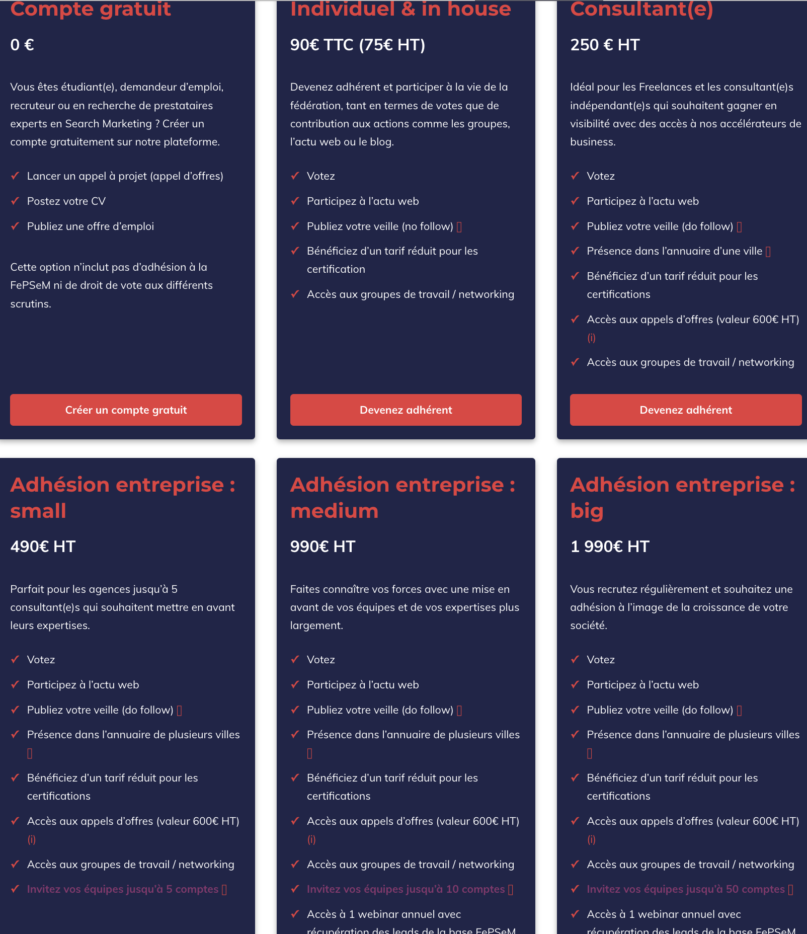 Si vous souhaitez faire partie de la FePSeM (@FePSeM), vous devez impérativement adhérer. Choisissez l’adhésion qui correspond le mieux à vos besoins et rejoignez la FePSeM dès maintenant pour contribuer activement à l’avenir du Search Marketing en France.