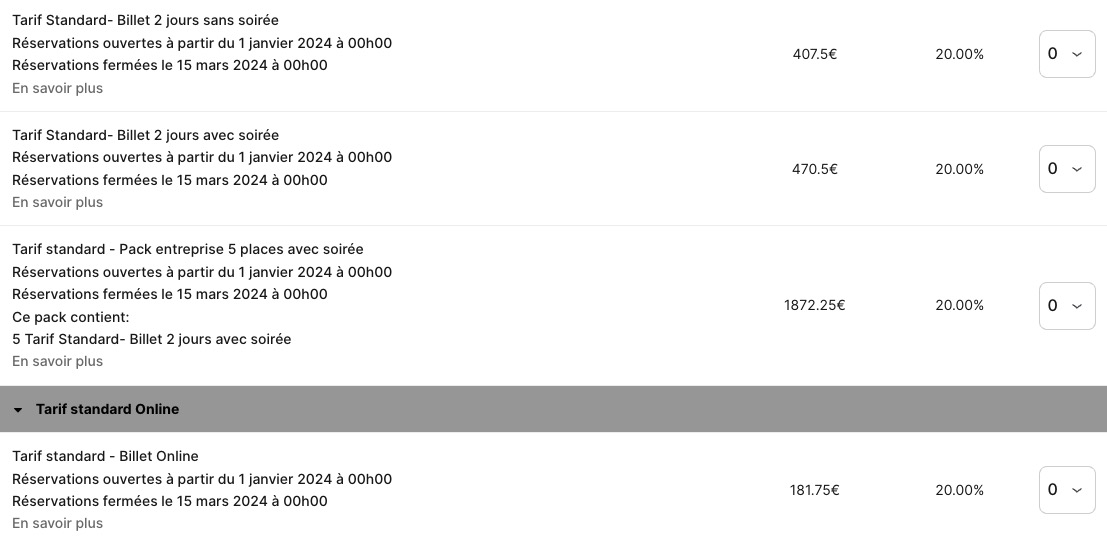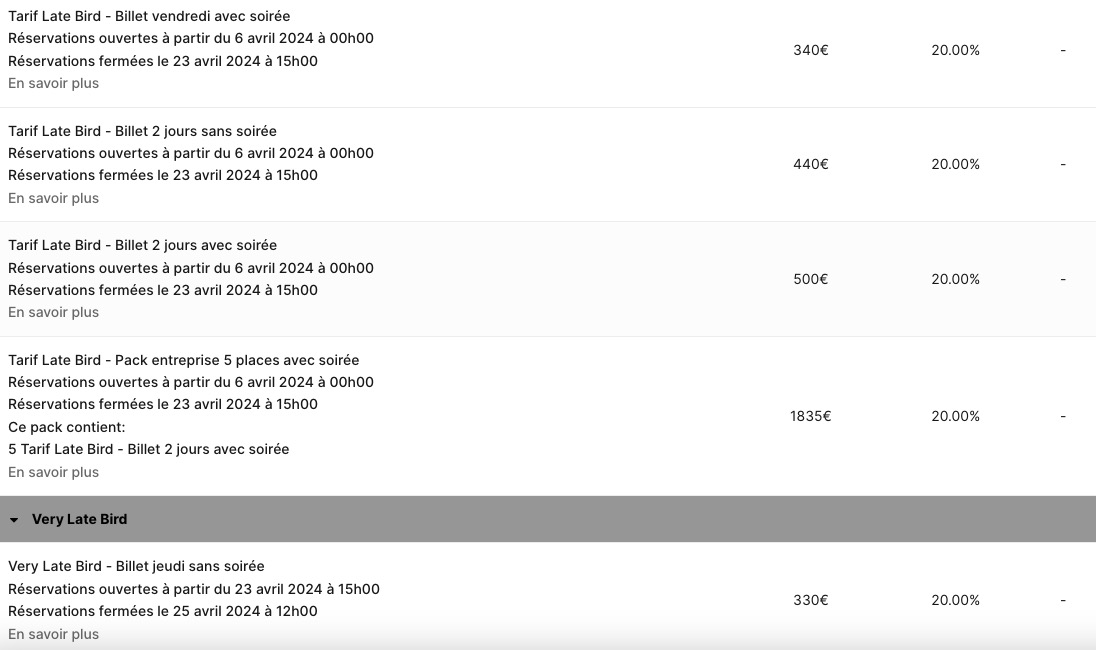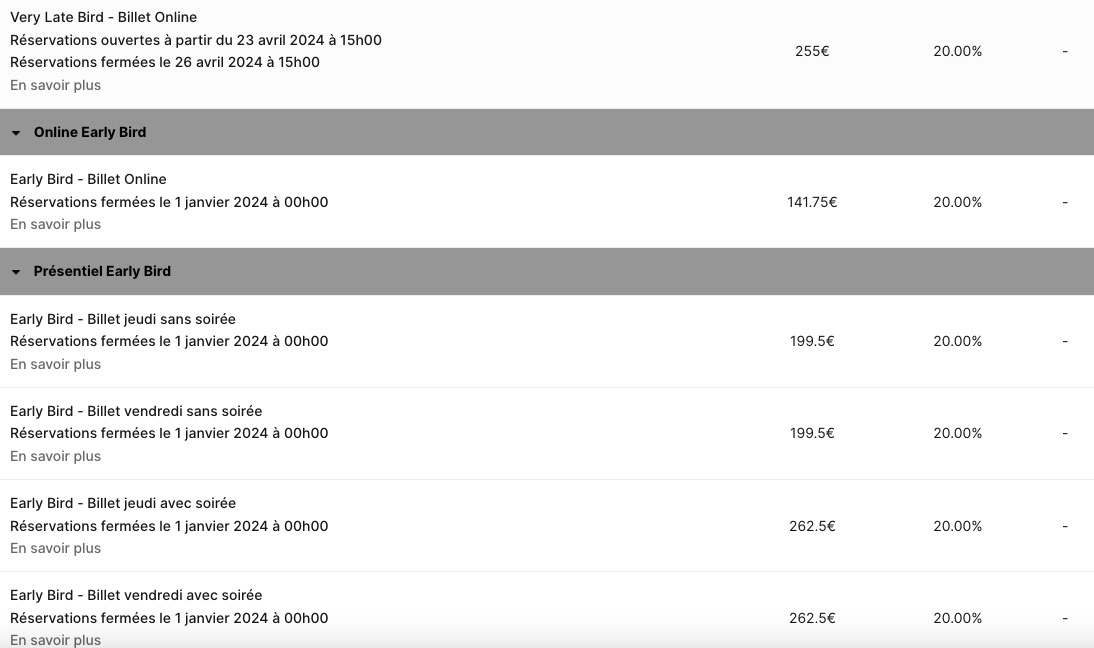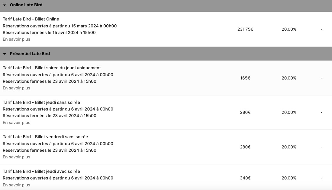 La billetterie est ouverte, mais des photos seront bien plus explicites que de longues phrases. L’association a prévu plusieurs packs (présentiel, online, Late Bird online, présentiel Late Bird, Online Early Bird, présentiel Early Bird) avec à chaque fois des accès spécifiques. En fonction de celui que vous choisissez, vous devrez payer environ 200/300 euros. Faites attention aux dates pour le présentiel ou la version online. Il y a également une date butoir pour les réservations.